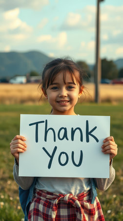 Young girl holds a sign expressing gratitude in a sunny field during a community event
