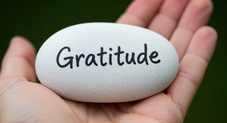 A smooth, white stone rests in an open palm, inscribed with the word Gratitude in elegant black lettering, symbolizing mindfulness and the power of positive thinking.