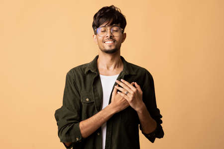Peaceful hindu guy holding hands over heart, beige background