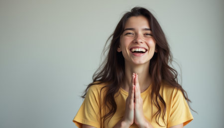 A cheerful young woman with long, wavy hair smiles brightly, her hands pressed together in a gesture of gratitude. The soft, neutral background enhances her radiant expression, capturing a moment of pure joy and appreciation.