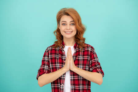 praying red haired woman. happy redhead woman casual style. express positive emotions
