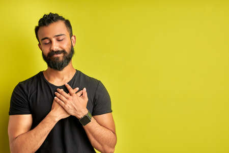 kind arabic man is grateful for something isolated on green background, male with closed eyes hold hands on chest