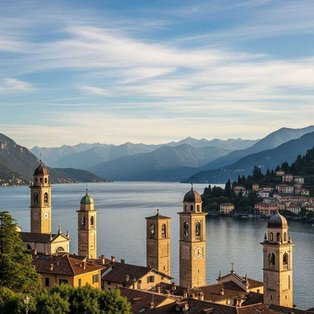 A serene lake town with historic bell towers and majestic mountains in the background at sunrise
