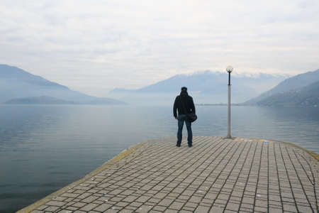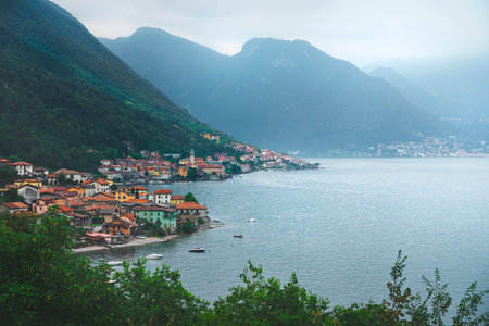 Photo of foggy mountains in Como lake in Lombardy, Italy. Sunset view over the mountain