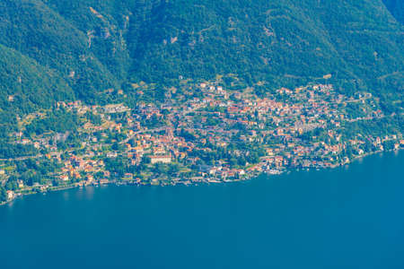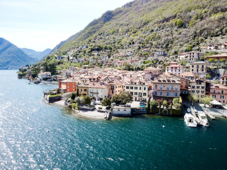 An aerial view of Argegno, Como a town on the foothills of a mountain and on the coast of scenic Lake Como. Rooftops vintage colorful houses, a boat ramp and a narrow mountain road by the lake is seen