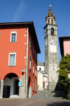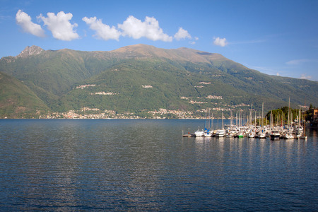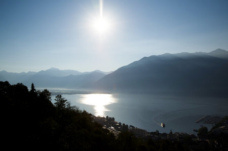 View of the city of Ascona, Switzerland. View of the lake and mountains, sunny day. Beautiful landscape