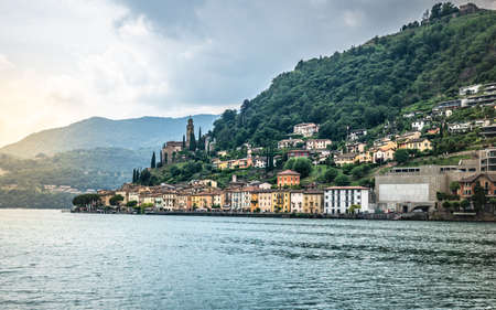 Morcote lakeside village scenic townscape view taken from Lake Lugano and dramatic light in Morcote Ticino Switzerland
