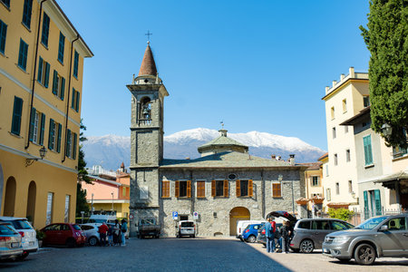 BELLANO, ITALY - APRIL 2022: Church of Santa Marta on the Piazza S. Giorgio in Bellano, a town on the shore of Lake Como. Charming location with typical Italian atmosphere. Bellano, Lombardy, Italy.