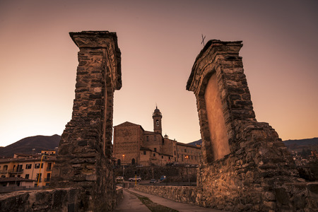 landscape of a medieval village seen from an ancient stone bridge at sunset in winter