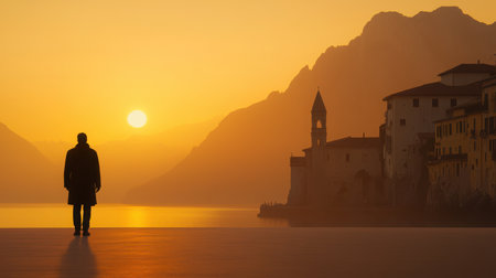 A solitary figure stands at sunrise by a serene lake, surrounded by majestic mountains and historic architecture, capturing a moment of tranquil beauty.