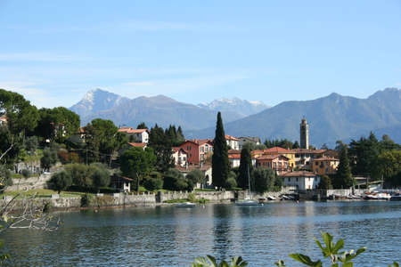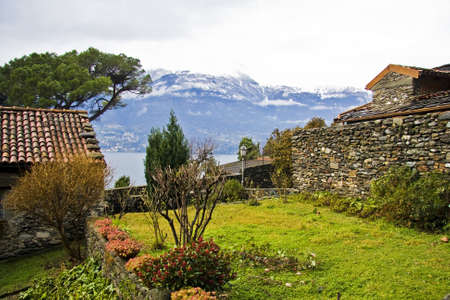 Traditional lakeside town and snow capped mountains, Lake Como, Italy
