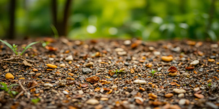 A macro view of small pebbles and soil, showing a variety of colors and granular textures in sharp detail.