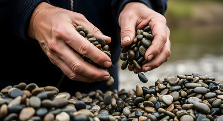 A person's hands hold a collection of smooth, wet river stones, letting some drop onto a larger pile below. The image captures the tactile sensation and natural texture of the polished rocks.