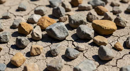 A close-up view of various jagged rocks scattered across a surface of dry, cracked earth. The image highlights the textures of the arid ground and stones, symbolizing drought or desert environments.
