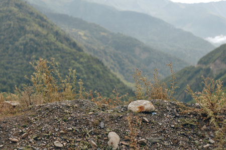 Rocky trail in mountainous terrain during the day for travelers, hiking in the open air, in summer or spring, texture, free space