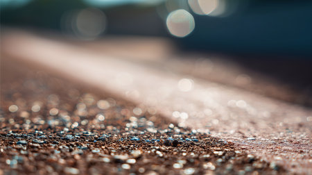 Close-up macro asphalt road texture in an orange summer evening sunset. Blurred background