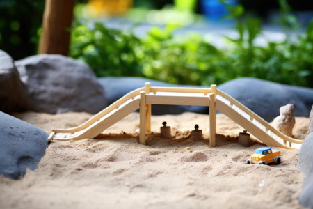 a miniature wooden bridge inside a sandbox, created with generative ai