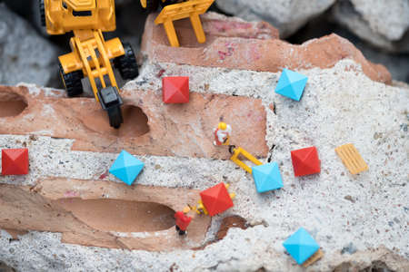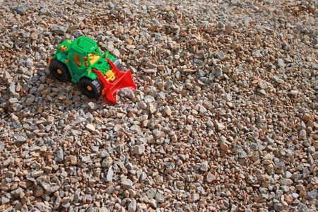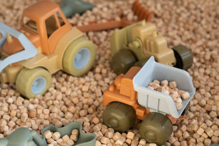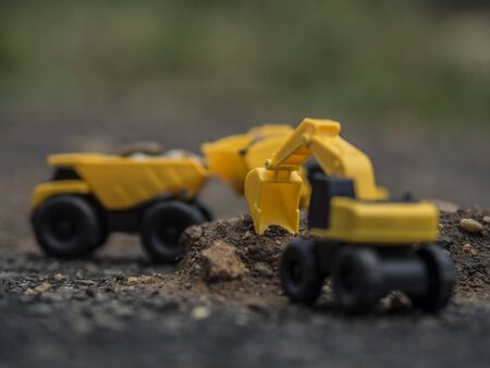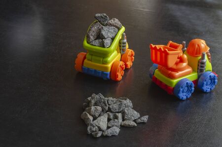 Plastic toys trucks. A toy car excavator loads rubble into a truck bucket. A stack of rubble in the foreground. Construction topics. Selective focus.
