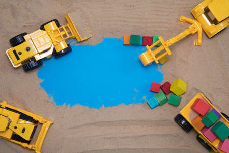 Playground with different toy transportation. Trucks and excavators for playing in the sand