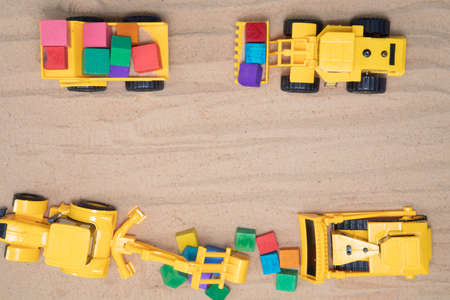 Toy tractors work in the sand Wooden toy car in cartoon style on yellow background. Colorful and Transportation background, eco kid toys Montessori .