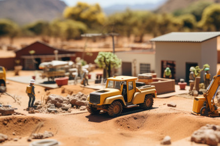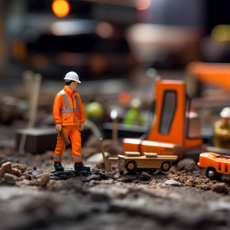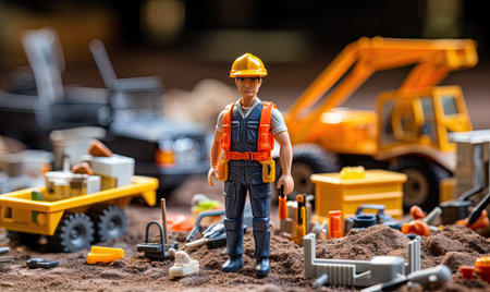 Vibrant lego inspired construction scene featuring colorful tools and machinery on city street