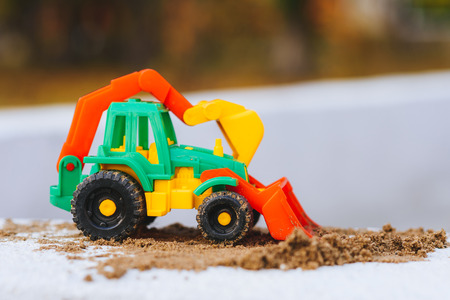 Orange plastic toy tractor with bucket build shells tower of sand. Space for text.. High quality photo