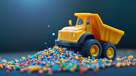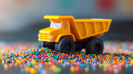 A yellow toy dump truck spilling tiny colorful beads, emphasizing fun and creativity