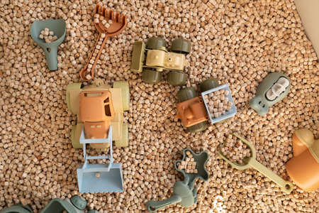 A modern childrens sandbox with toys. Sandbox filler in the form of wooden small wooden cubes