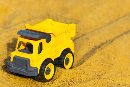 toy yellow car in sandbox, close up. children's toy in the sandbox. car in the sandbox. car wheel tracks on sand.