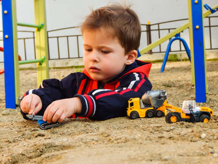 Little boy playing with toy cars on the playground. Child having fun outdoors.
