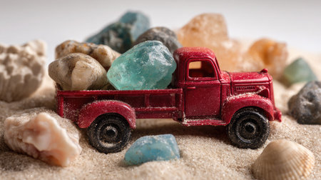 Close-up of toy truck with textured plastic toys inside, resting on soft and even beach sand