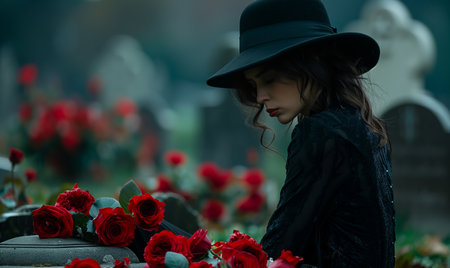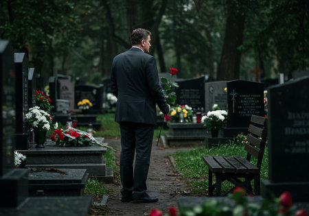A man in a dark suit stands in a cemetery, holding a red rose, paying respects at a grave. Generative Ai