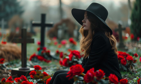 A woman sitting on a grave surrounded by flowers