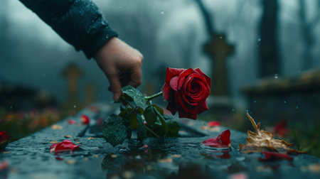 Close-up of a hand putting a red rose on a gray granite headstone. Funeral ceremony, farewell