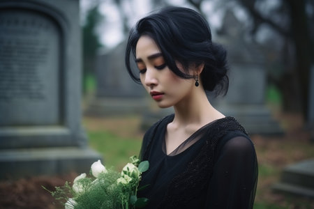 Portrait of a beautiful asian woman in black dress at the cemetery.