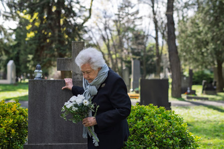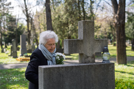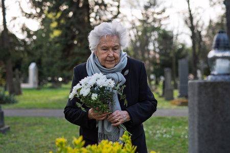 Elderly widow bringing flowers to a grave at cemetery.