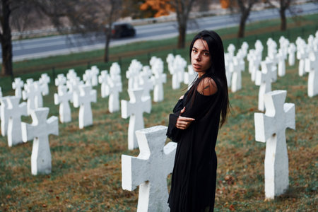 Young woman in black clothes visiting cemetery with many white crosses. Conception of funeral and death