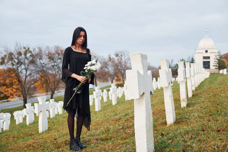 With flowers in hands. Young woman in black clothes visiting cemetery with many white crosses. Conception of funeral and death
