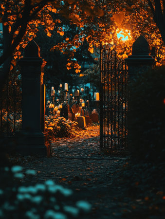 Autumnal Cemetery Gate Evening Ambiance Peaceful Scene Mysterious Graveyard Night old dark mood path