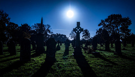 A haunting graveyard scene illuminated by a bright full moon. Shadows stretch over ancient tombstones, creating an eerie yet tranquil atmosphere. Perfect for horror themes.