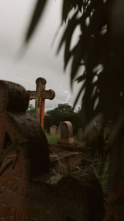 Graveyard, shadowy specter, crumbling tombstones, lightning storm, spooky atmosphere, photography, silhouette lighting, motion blur, Macro shot
