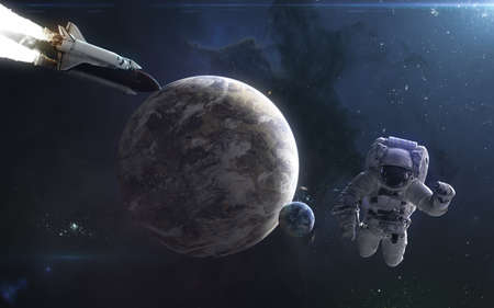 Exoplanets, astronaut, space shuttle in deep space. Space landscape in blue light. Science fiction art. Image in 5K for desktop wallpaper. Elements of the image were furnished by NASA