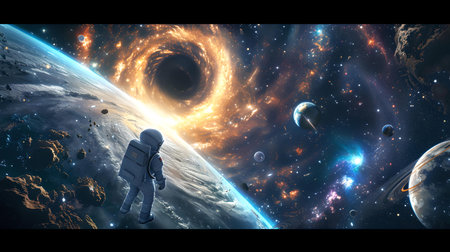 An astronaut floats in a dark space, near a large black hole. The scene showcases an artistic illustration with bright, contrasting colors and a swirling background. The composition suggests deep space exploration, suitable for use in educational materials or science-themed projects. The image evokes a sense of wonder and the unknown.