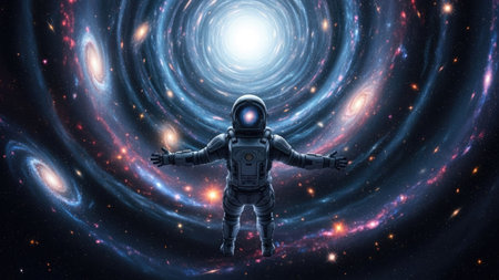 An astronaut floats in a celestial vortex, arms outstretched. The scene presents a cosmic environment with swirling nebulas, galaxies, and a bright light source. The illustration uses digital art techniques to convey depth, texture, and a sense of wonder. Suitable for scientific, educational, and creative projects.
