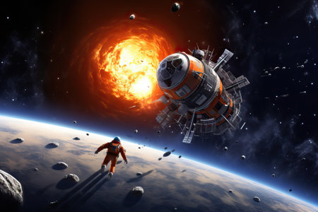 3D illustration of astronaut near the Earth looks at burning asteroids. 5K realistic science fiction art.