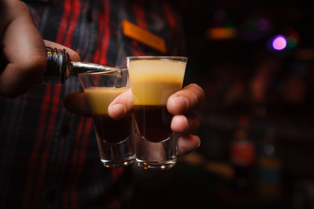 Bartender pouring strong alcoholic drink into small glasses on bar, shots.