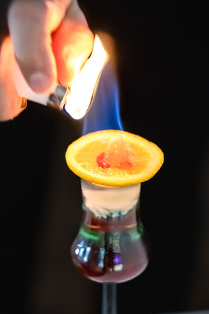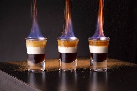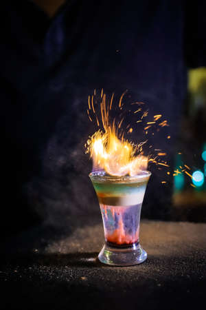 The fire scatters into sparks. In the glass, the cocktail is brown-red, the top is white and the top is emerald, which is set on fire, the layers are not mixed.