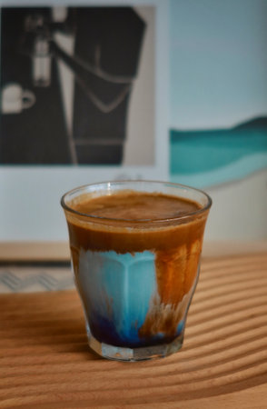 Set of unearthly cocktail shots with colourful turbulent liquor resting on the bar counter