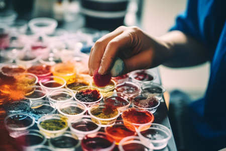 Artist pours resin into multiple small cups arranged on a marbled surface, showcasing a creative workspace filled with art materials