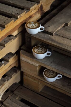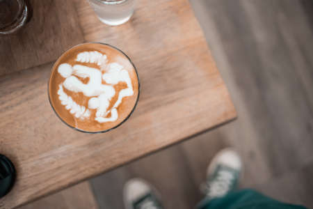 Hot coffee cup of latte art, coffee on wooden table in the morning. Top view with of people on jeans